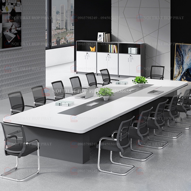Mặt bàn được xử lý vuông vắn với kích thước lớn, phù hợp cho các cuộc họp đông người (từ 12 đến 20 người). Phần trung tâm màu đen chạy dọc được bố trí tinh tế, tạo điểm nhấn đồng thời là vị trí tích hợp hộp điện, micro, hoặc thiết bị trình chiếu vô cùng tiện lợi.