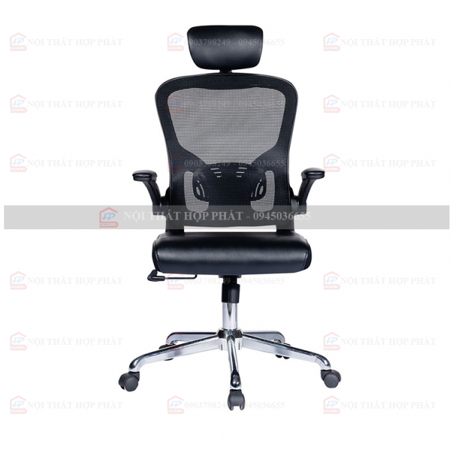 Ghế lưới lãnh đạo lưng cao, đệm bọc PVC, khung tựa nhựa bọc vải lưới. Tay có thể gấp lên - xuống khi sử dụng. Chân thép mạ